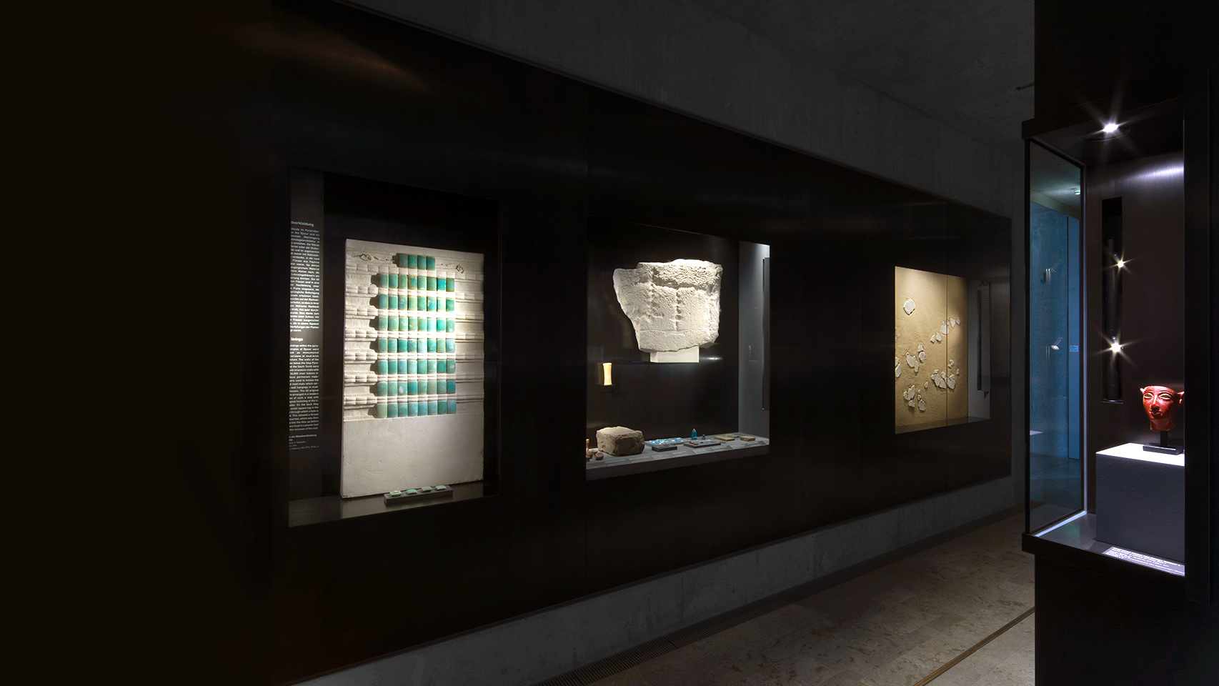 Three wall cases on one side of the room contain examples of faience and painted wall decoration. Tiles from the underground galleries of the Pyramid of Djoser in Sakkara imitate reed mats in a more durable material; preliminary sketches for a painting from the walls of a Theban tomb provide insight into the work process. Between them, foundation ceremonies, with their succession of rituals, are explained and foundation deposits from different periods can be seen.