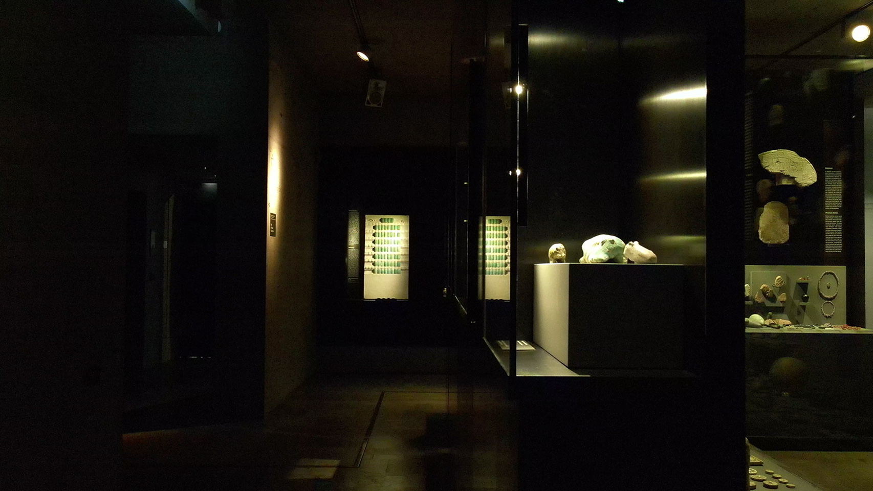 Tall exhibition cases are arranged around the centre of the room to provide an enclosed space. On the outside, individual displays reminiscent of jewellers’ showcases highlight 20 masterpieces from all types of material, among them quite famous pieces such as the glass chalice of Thutmosis III., the gold signet ring of Ramses II., the small faience hippopotami of the Middle Kingdom, a curved sword with gold inlays and the head of red jasper, an acquisition of the Friends of the Museum.