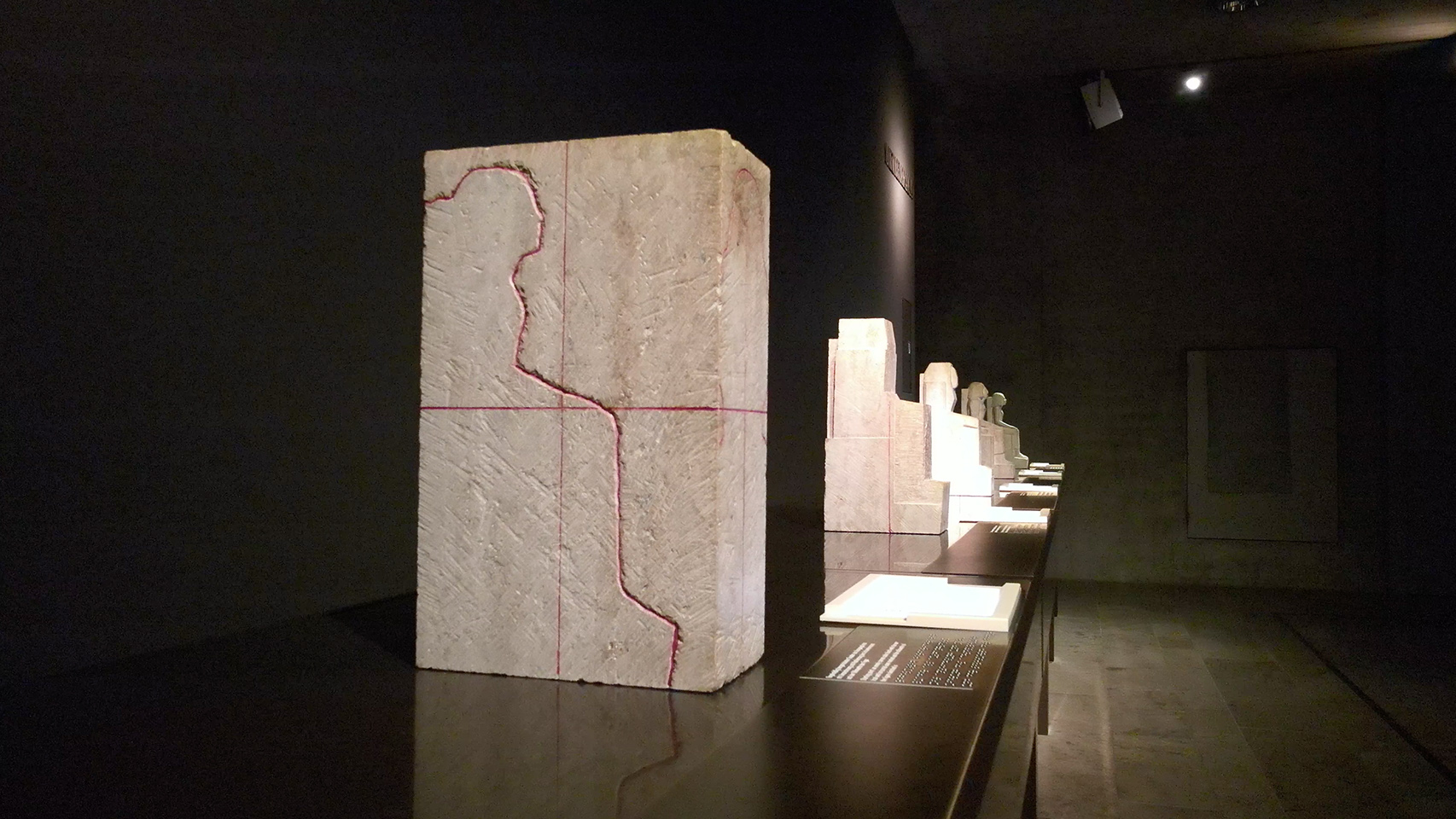 Numerous examples of unfinished pieces make it possible to reconstruct the method used by Egyptian sculptors when making a statue – a series of steps leading from a rectangular block of stone to a coarsely blocked-out shape to the finished and detailed figure – a technique easy enough to understand when presented visually. The seriation shown here was created out of limestone by the sculptors working for Pfanner, the company of restorers who is also responsible for curating the conservation and restoration of the museum’s stone objects.