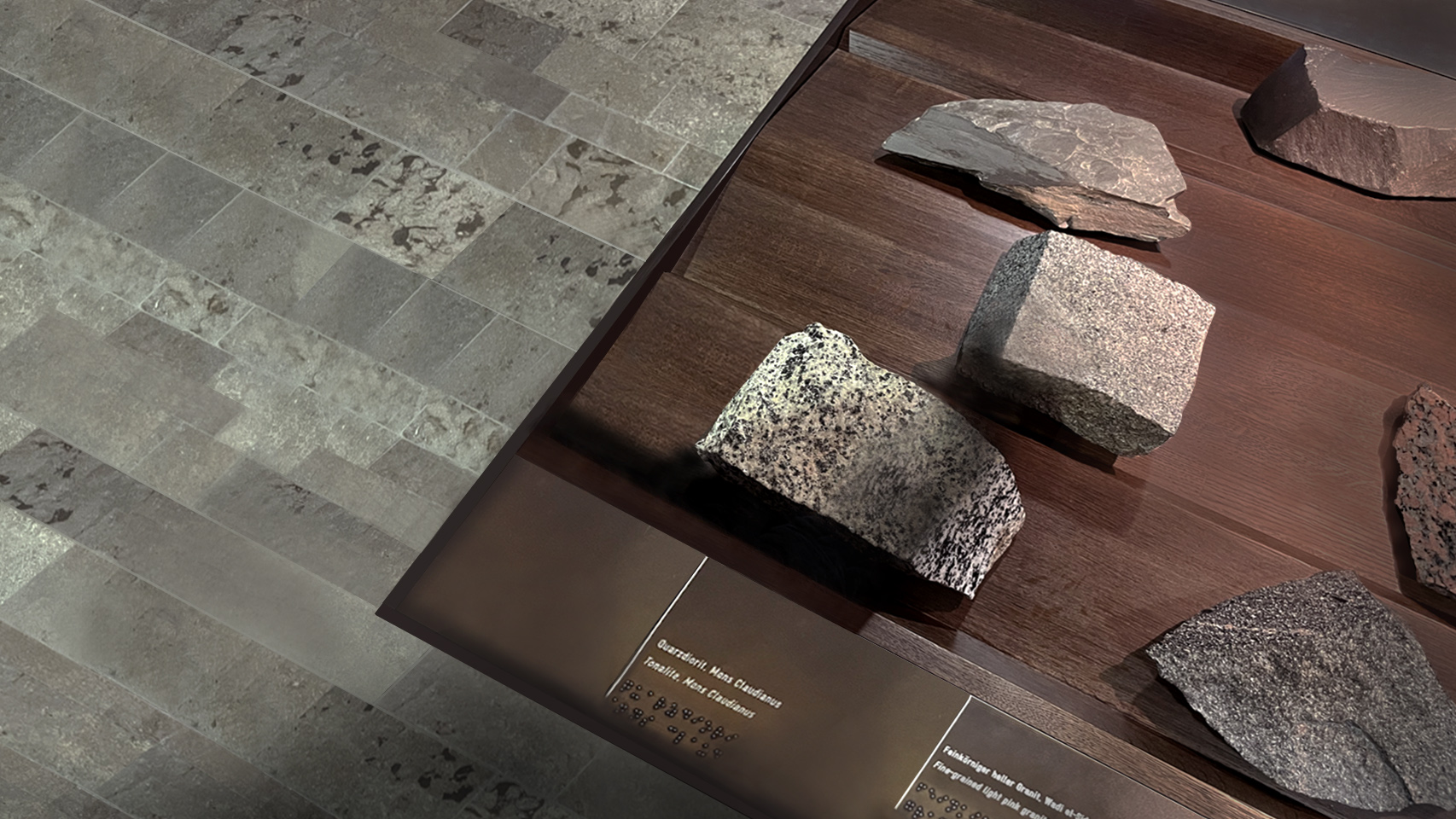 The stone samples on the large table in the centre of the room are polished smooth on one side to allow visitors to grasp the difference between the rough, freshly-hewn stone and the surface of a polished object. Visitors make good use of it, too. In the neighbouring room “ARTisan Crafts”, you can see original objects made from these stones.