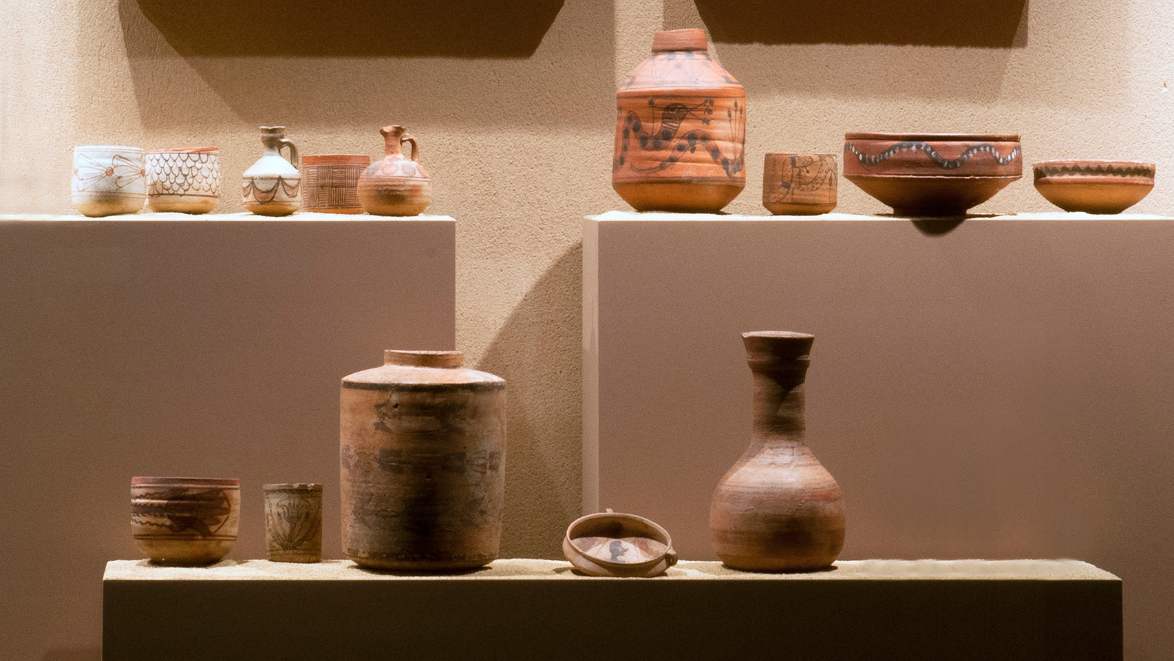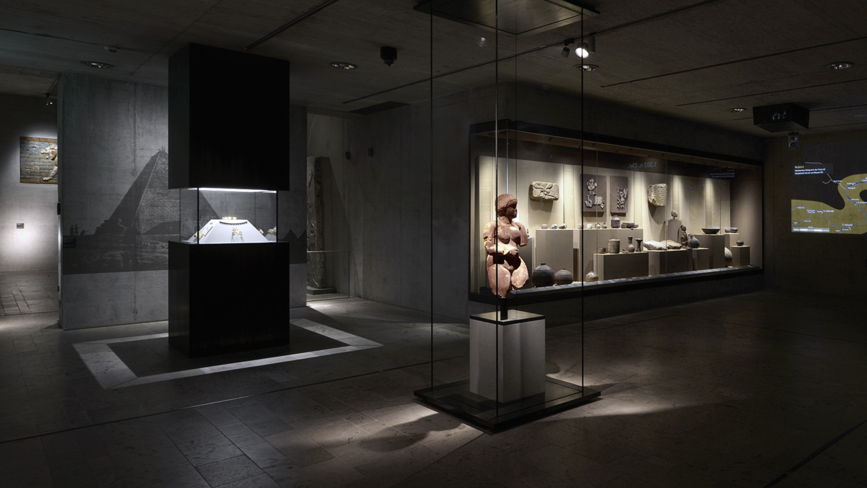 Since the area south of the First Cataract is, more so even than Egypt, strongly defined by the desert, sand was chosen as the main design element for this room. Pottery vessels placed upright or laid down on the sand (coloured to imitate the local hues) imbue this room with a very special atmosphere. This also makes it possible to avoid the use of modern stands and plinths usually necessary for the pots and their mostly rounded bottoms.