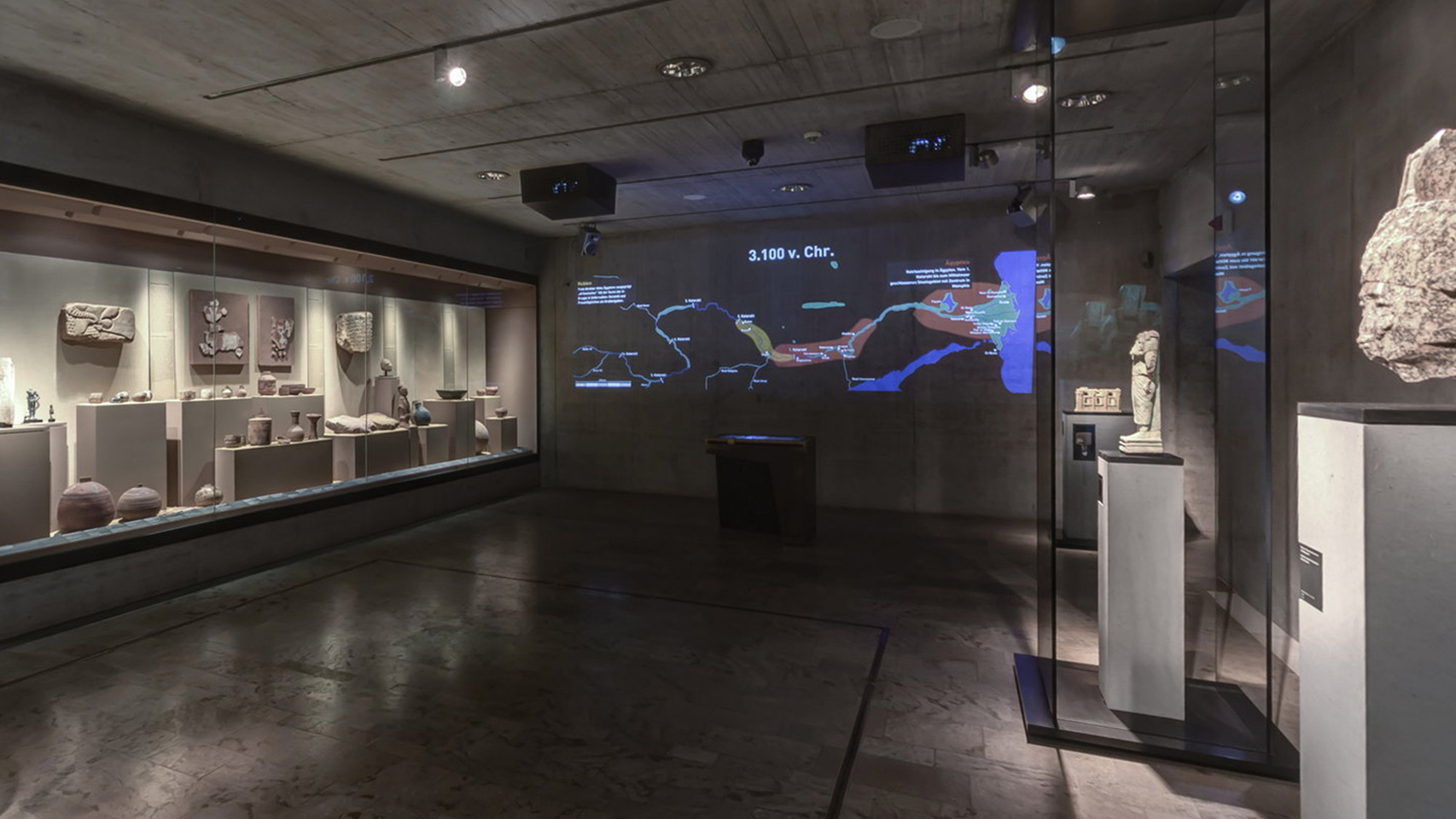 A projection on the wall illustrates the changing dynamics between the cultures of Egypt and Sudan, the range of their territories, and their main settlements and cities, from 10,000 BC until today. Additionally, the screen provides information on the history, architecture, and art of Ancient Sudan.