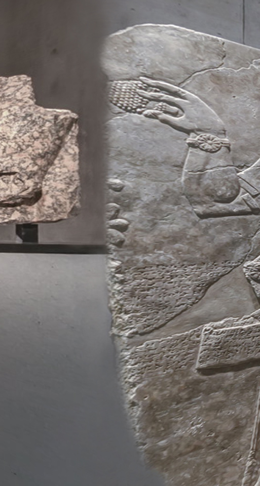 The reliefs come from the 9th-century northwestern palace of Assurnasirpal II in Nimrud, the capital of the Assyrian Empire along the Tigris (now in Irak). They depict winged genii, powerful spirits that were thought to protect the king and his household. These relief slabs once lined the mudbrick wall. They come from different rooms and corridors within the palace.