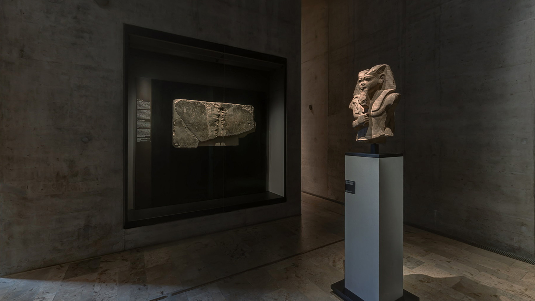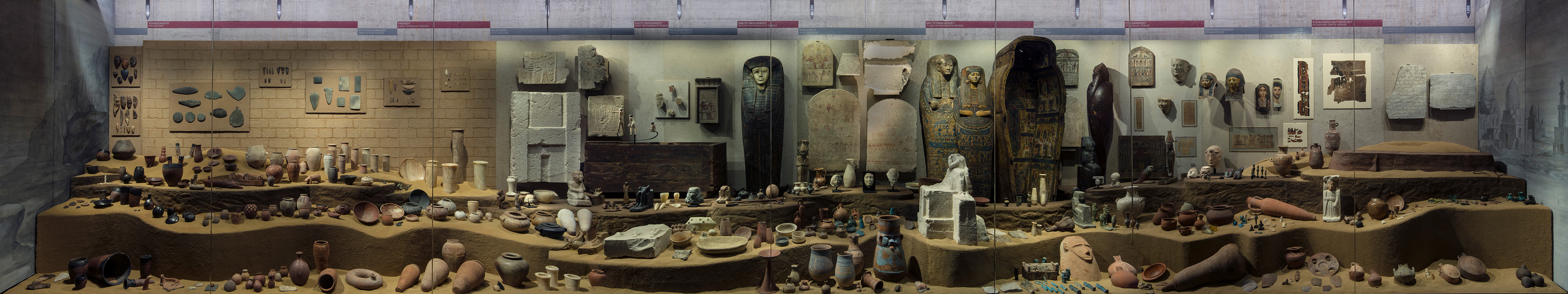 Desert Landscape - In a large, 17m-long exhibition case, some 750 objects, arranged chronologically, tell the tale of five thousand years of Egyptian history, from 4000 BC to 1000 AD. A museum within the museum – and whereas in the previous exhibition halls most of the objects are celebrated individually as works of art, the atmosphere here is different, with a more archaeological presentation. To this end, 8 tonnes of custom-made sand in two different colour tones was introduced to suggest a desert landscape on three levels.