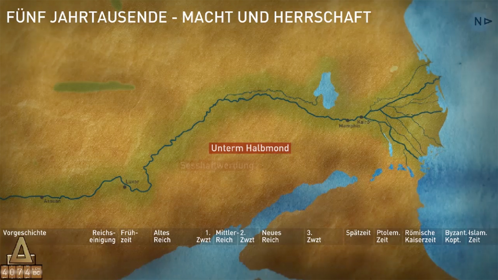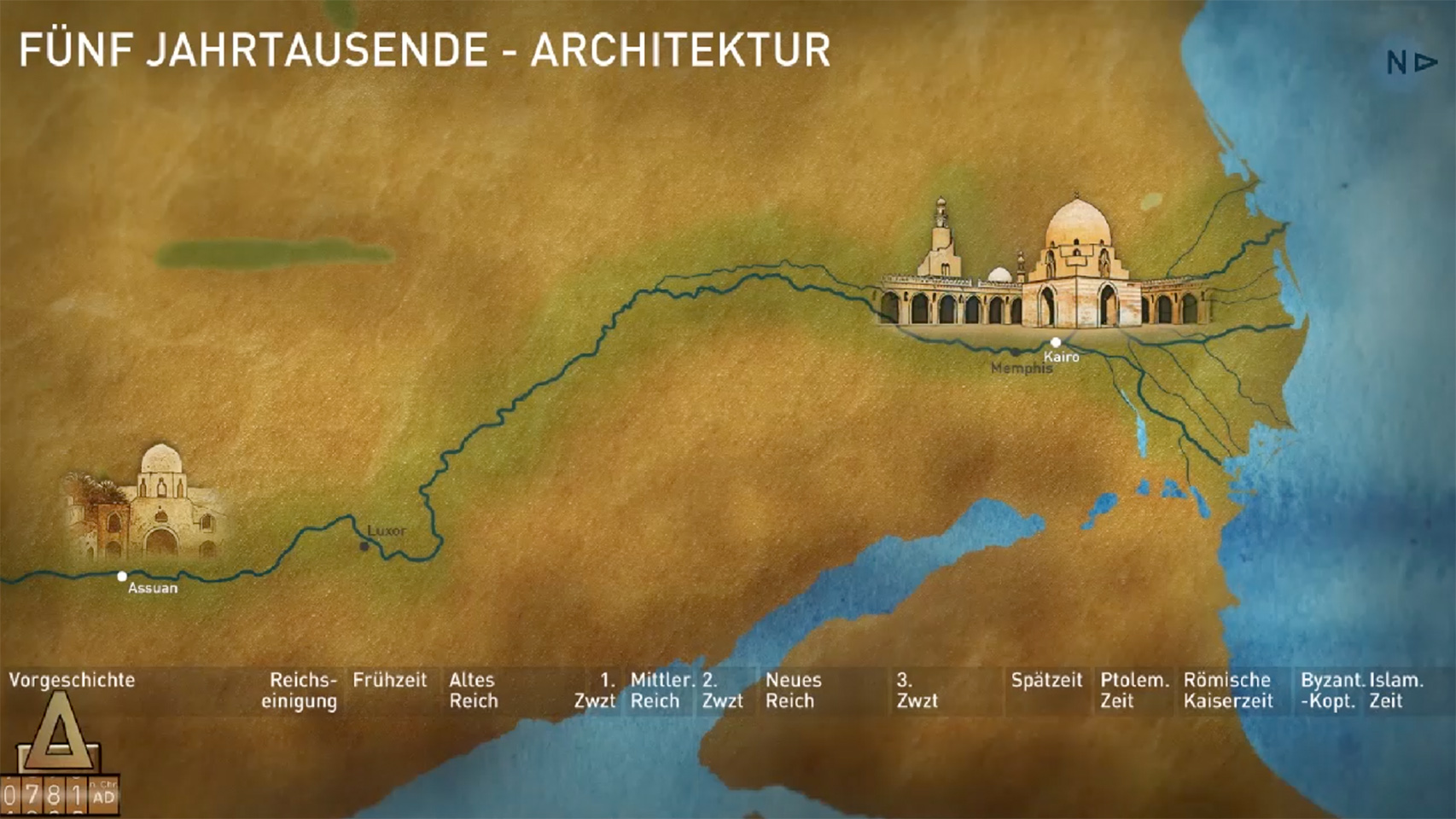 By moving a slider over a timeline, visitors can choose a period of Egyptian history and display a map of Egypt with the important sites for that period, from the Delta in the North to the Nubian desert in the South. Animations illustrate famous discoveries or buildings such as temples and tomb complexes. Clicking on the monuments reveals photographs and information.