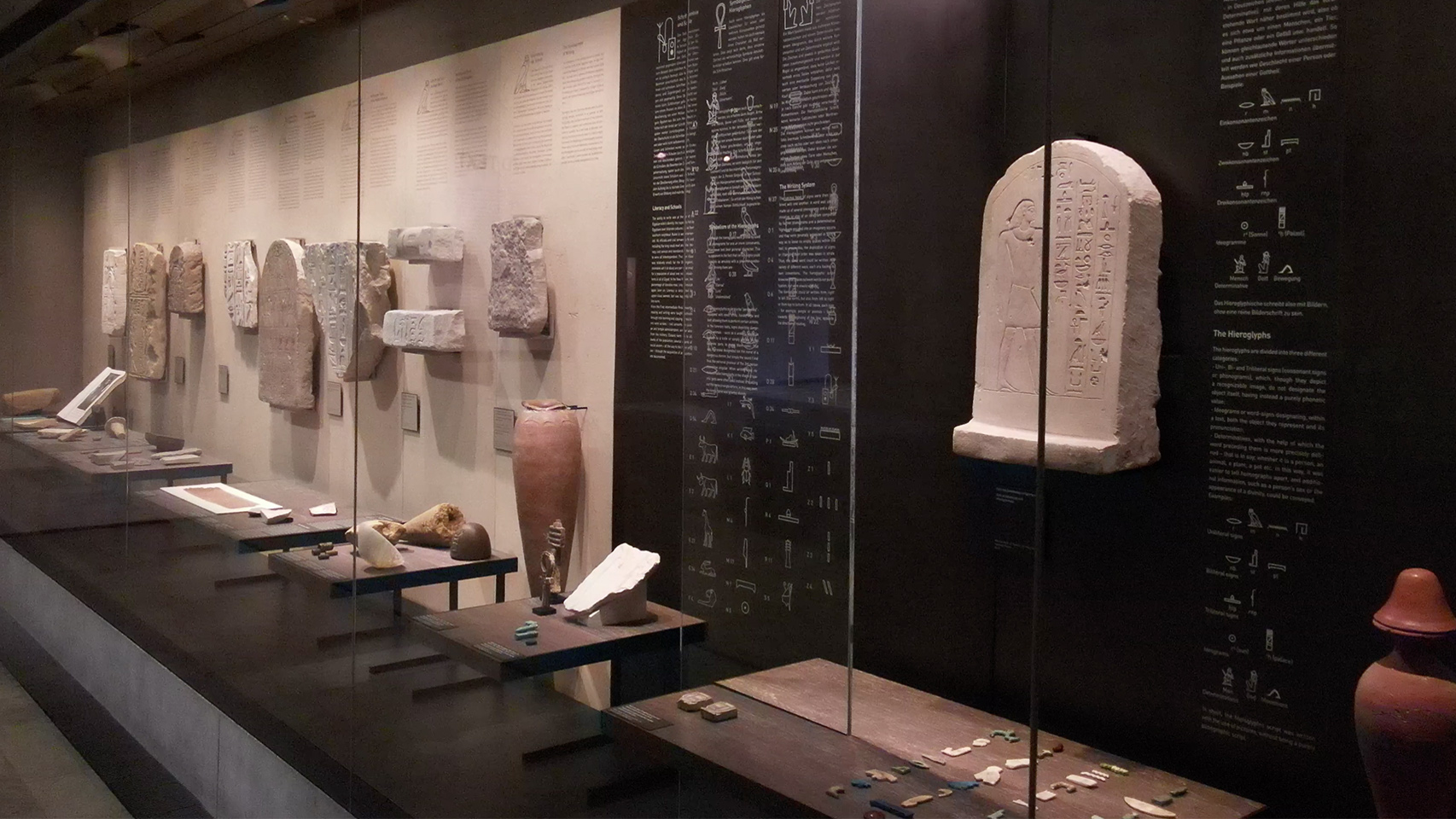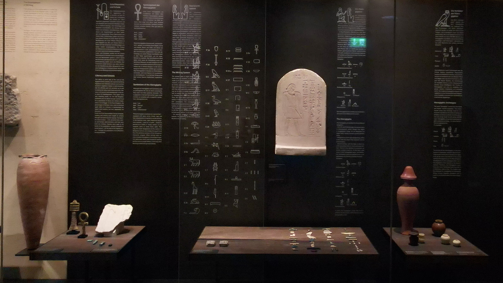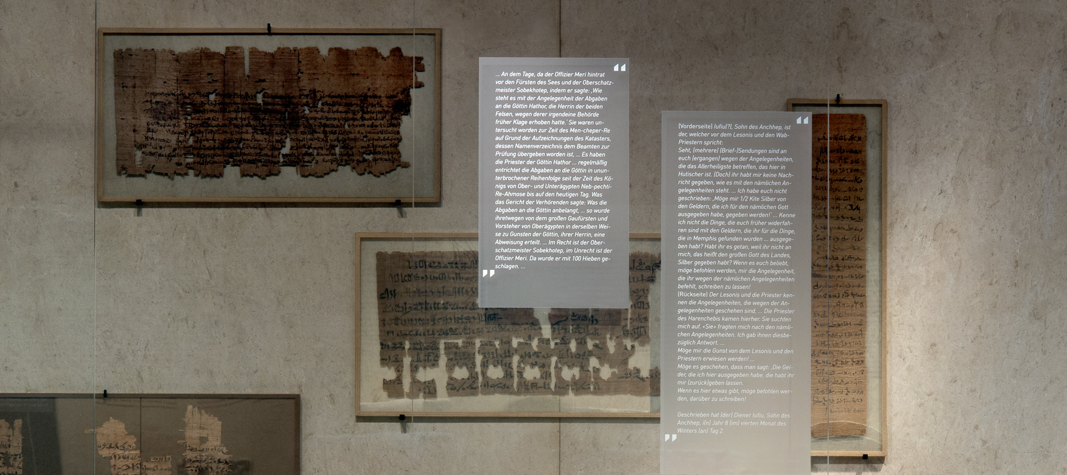 Inscribed glass panels allow visitors to read the translations for the texts written on papyrus or ostracon on display in this case, so they can experience the full range of Egyptian texts for themselves right next to the original objects. In addition, the Media Guide offers translations of other objects along with an introduction to the different genres. English translations are pending.
