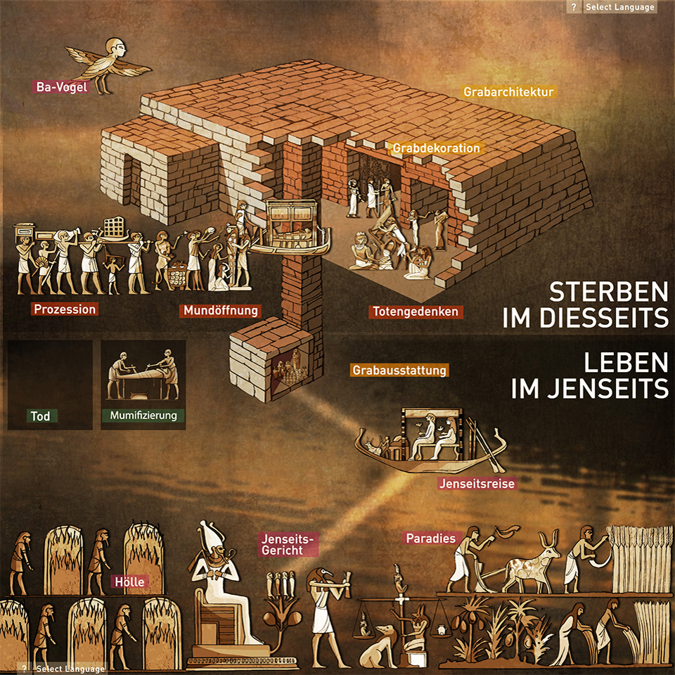 Die obere Hälfte dieser Medienstation spielt im Diesseits und greift verschiedene Themen rund um die Bestattung auf: die Prozession zum Grab und das davor stattfindende Ritual der Mundöffnung, Architektur und Dekoration des Grabes in verschiedenen Epochen und die Gebräuche des Gedenkens an die Toten. Voraussetzung für das Leben im Jenseits ist die Mumifizierung, die ebenso wie der Tod einem Tabu unterliegt und kaum thematisiert wird. Einen breiten Raum hingegen nehmen die Reise ins Jenseits und das Jenseitsgericht ein als Voraussetzung für Paradies oder Hölle.
