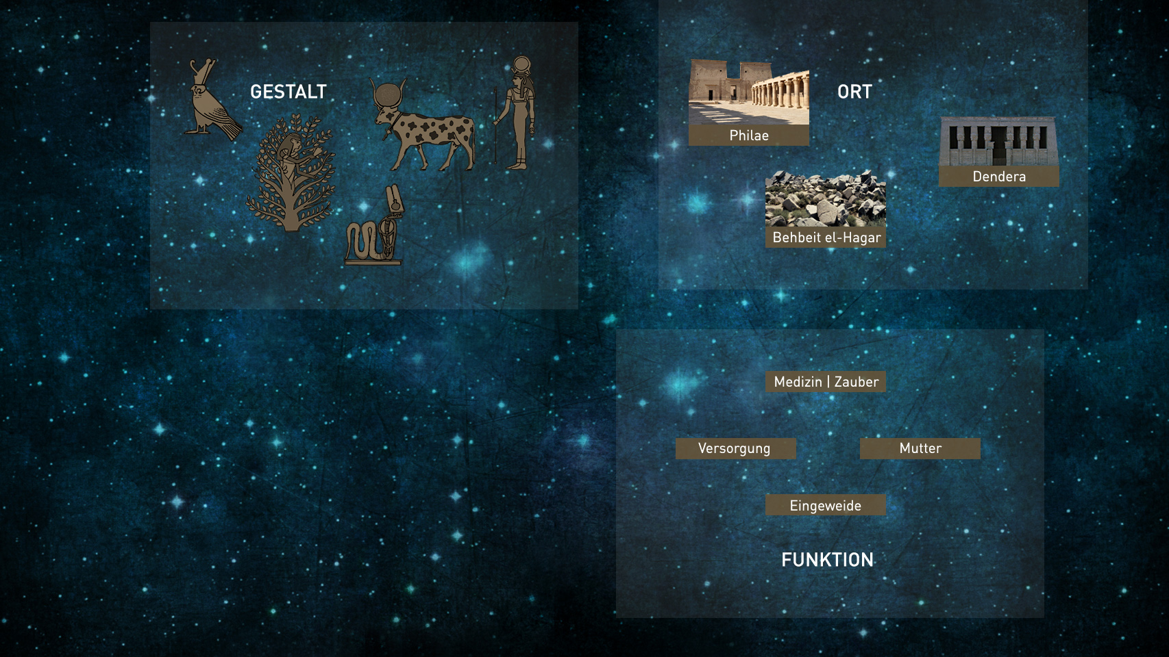 Ein Sternenhimmel leuchtet auf den vier Feldern der Medienstation, die mit „Gestalt“, „Ort“, „Funktion“ und „Name“ überschrieben sind. Wo wird dieser Gott verehrt? Für welche Bereiche ist diese Göttin zuständig? Und welche Gestalt können die Götter annehmen? Ein Klick auf die Sterne zeigt die (manchmal verwirrend vielen) Möglichkeiten auf.
