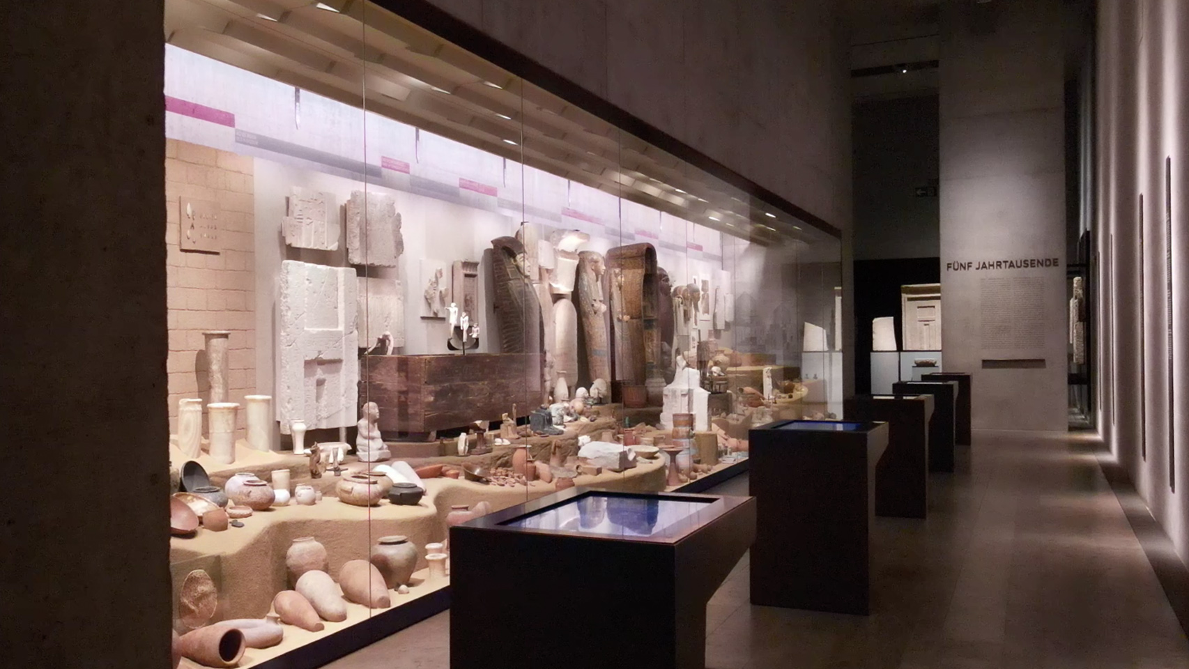 Wüstenlandschaft – In einer Großvitrine von siebzehn Metern Länge erzählen rund 750 Objekte, chronologisch angeordnet, fünf Jahrtausende ägyptischer Geschichte, von 4000 v. Chr. bis 1000 n. Chr. Ein Museum im Museum – und während in den vorausgehenden Räumen die Objekte meist einzeln als Kunstdenkmäler zelebriert werden, ändert sich nun die Atmosphäre hin zu einer archäologischen Präsentation. Dafür wurden 8 Tonnen eigens hergestellten Sandes in zwei Farbtönen eingebracht, um eine Wüstenstruktur in drei Ebenen anzudeuten.