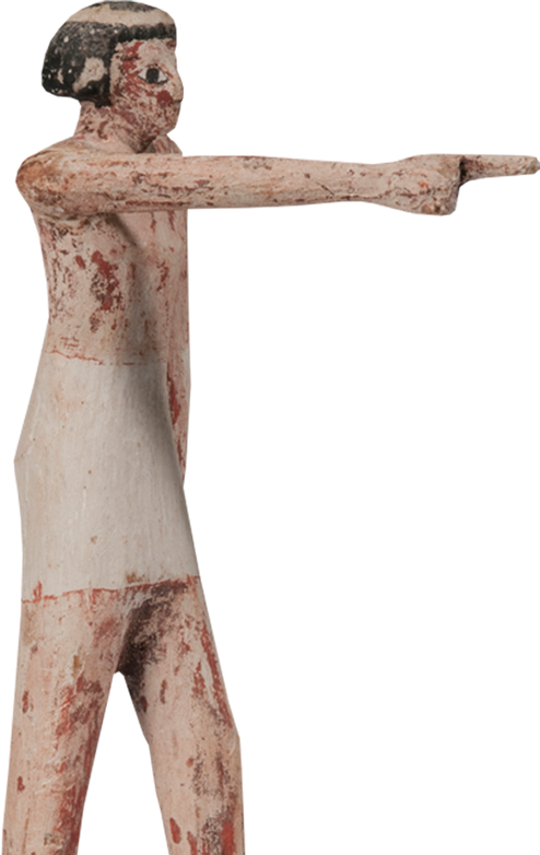 Auswahl – Ergänzend zur Keramik werden in der Großvitrine Gefäße aus Stein und Objekte zum Thema Grabausstattung (Reliefs und Stelen, Särge und Beigaben) sowie Rundplastik gezeigt. Hinzu kommen typische Objekte für jede Epoche wie Modellfiguren aus Holz (Bild) für das Mittlere Reich. An der Rückwand verweist der Wechsel von Lehmziegeln zu Kalksteinplatten im frühen Alten Reich auf den Übergang zur Architektur in Stein.