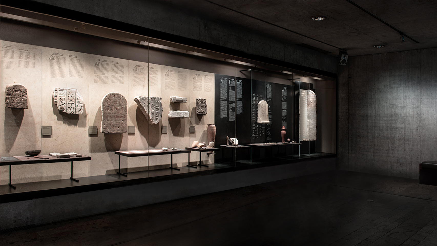 Den Auftakt zum Thema „Schrift“ bildet eine große Stele, deren lange biographische Inschrift der Besucher anhand einer eingestellten Glasplatte mit der Übersetzung Zeile für Zeile verfolgen kann. Dieses gestalterische Element wird gleich im Anschluss eingesetzt, um das System der Schrift, ihre Anfänge und Vorbilder sowie die verschiedenen Kategorien der Hieroglyphen zu erklären – stets unter Einbeziehung von Originalobjekten.
